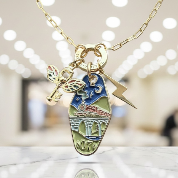 Wizards Train. Genuine 14k gold-filled center ring and side charms, paired with a solid 925 sterling silver chain in matching rich 14k gold finish and a hand-enamelled center charm in rich 14k gold finish (nickel-free). Sealed throughout for enduring radiance.
